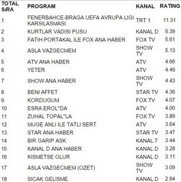 Trt 1 ekranlarında yayınlanan Fenerbahece-Braga Uefa Avrupa Ligi Karşılaşması 11.31 reytingle 10 Mart Perşembe gününün en çok izlenen programı oldu.Fenerbahece-Braga Uefa Avrupa Ligi Karşılaşması büyük bir başarıya imza atarak Kurtlar Vadisi Pusu’yu geride bıraktı. Kurtlar Vadisi Pusu 6.39 reytingle ancak 2. olabildi. İlginçtir ki reytinglerde 3.lüğe ise 5.61 reytingle Fatih Portakal İle Fox Ana Haber yerleşti.