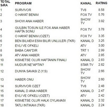 Tv8 ekranlarında yayınlanan Survivor 8.58 reytingle 10 Nisan Pazar gününün en çok izlenen programı oldu. Survivor büyük bir başarıya imza atarak O Hayat Benim’i geride bıraktı. O Hayat Benim 5.76 reytingle ancak 2. olabildi. İlginçtir ki reytinglerde 3.lüğe ise 3.92 reytingle Show Ana Haber yerleşti.