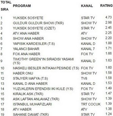 Star tv ekranlarında yayınlanan Yüksek Sosyete 4.73 reytingle 11 ağustos perşembe günü en çok izlenen programı oldu. Yüksek Sosyete büyük bir başarıya imza atarak Aşk Laftan Anlamaz’ı geride bıraktı. Güldür Güldür Show 2.98 reytingle ancak 2. olabildi. İlginçtir ki reytinglerde 3.lüğe ise 2.45 reytingle Yüksek Sosyete Özet yerleşti.