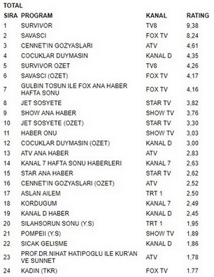 Tv8 ekranlarında yayınlanan Survivor 11 mart pazar akşamı aldığı 9.38 reytingle en çok izlenen program oldu. Survivor büyük bir başarıya imza atarak fox tv ekranlarında yayınlanan Savaşçı geçmeyi başardı.Savaşçı 8.24 reyting oranıyla 2. olurken. İlginçtir ki reytinglerde 3.lüğe ise 4.61 oranla Cennetin Gözyaşları yerleşti.