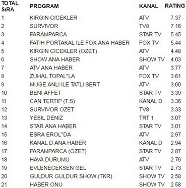 Atv ekranlarında yayınlanan Kırgın Çiçekler 7.37 reytingle 11 Nisan Pazartesi gününün en çok izlenen programı oldu. Kırgın Çiçekler büyük bir başarıya imza atarak Survivor‘ı geride bıraktı. Survivor 7.16 reytingle ancak 2. olabildi. İlginçtir ki reytinglerde 3.lüğe ise 5.45 reytingle Paramparça yerleşti.