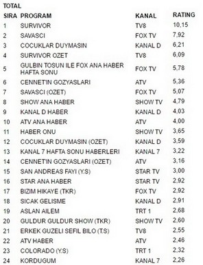 Tv8 ekranlarında yayınlanan Survivor 11 şubat pazar akşamı aldığı 10.15 reytingle en çok izlenen program oldu.Survivor büyük bir başarıya imza atarak fox tv ekranlarında yayınlanan Savaşçı’yı geçmeyi başardı.Savaşçı 7.92 reyting oranıyla 2. olurken. İlginçtir ki reytinglerde 3.lüğe ise 6.21 Çocuklar Duymasın yerleşti.