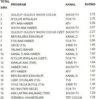 Show tv ekranlarında yayınlanan Güldüy Güldüy Show Çocuk 3.72 reytingle 12 ağustos cuma günü en çok izlenen programı oldu. Güldüy Güldüy Show Çocuk büyük bir başarıya imza atarak Nolur Ayrılalım’ı geride bıraktı. Nolur Ayrılalım 2.75 reytingle ancak 2. olabildi. İlginçtir ki reytinglerde 3.lüğe ise 2.45 reytingle Atv Ana Haber yerleşti.