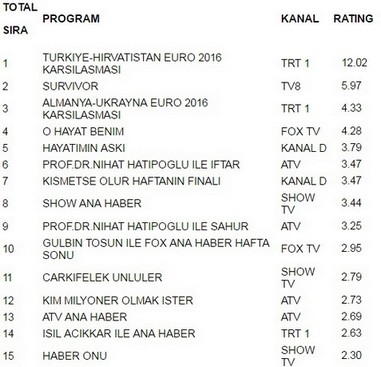 Kanal D ekranlarında yayınlanan Türkiye – Hırvatistan Euro 2016 Karşılaşması 12.02 reytingle 12 Haziran Pazar günü en çok izlenen programı oldu.Türkiye – Hırvatistan Euro 2016 Karşılaşması büyük bir başarıya imza atarak Survivor’ı geride bıraktı.Survivor 5.97 reytingle ancak 2. olabildi. İlginçtir ki reytinglerde 3.lüğe ise 4.33 reytingle Almanya – Ukrayna Euro 2016 Karşılaşması yerleşti.