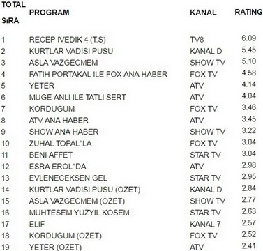 12 Mayıs 2016 Perşembe Reyting Sonuçları