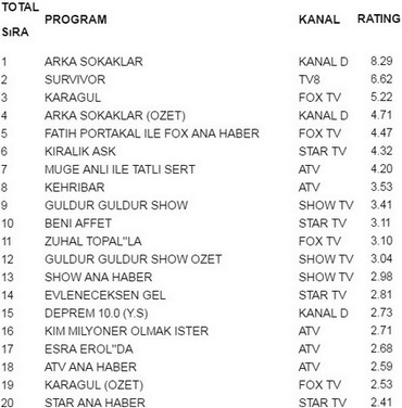 Kanal D ekranlarında yayınlanan Arka Sokaklar 8.29 reytingle 13 Mayıs cuma günü en çok izlenen programı oldu. Arka Sokaklar büyük bir başarıya imza atarak Survivor’ı geride bıraktı. Survivor 6.62 reytingle ancak 2. olabildi. İlginçtir ki reytinglerde 3.lüğe ise 5.22 reytingle Karagül yerleşti.