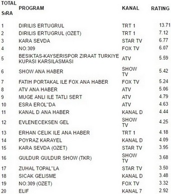 Trt 1 ekranlarında yayınlanan Diriliş Ertuğrul 13.71 reytingle 14 aralık çarşamba günü en çok izlenen programı oldu. Diriliş Ertuğrul Karşılaşması büyük bir başarıya imza atarak Kara Sevda’yı geride bıraktı.Dirili Ertuğrul (Özet) 7.12 reyting oranıyla 2. olurken. İlginçtir ki reytinglerde 3.lüğe ise 6.77 reytingle Kara Sevda yerleşti.