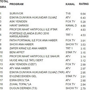 Tv8 ekranlarında yayınlanan Survivor 6.64 reytingle 14 Haziran Salı günü en çok izlenen programı oldu.Survivor büyük bir başarıya imza atarak Eşkiya Dünyaya Hükümdar Olmaz’ı geride bıraktı.Eşkiya Dünyaya Hükümdar Olmaz 6.43 reytingle ancak 2. olabildi. İlginçtir ki reytinglerde 3.lüğe ise 5.28 reytingle Aşk Yeniden yerleşti.