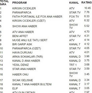 Atv ekranlarında yayınlanan Kırgın Çiçekler 10.45 reytingle 14 Mart Pazartesi gününün en çok izlenen programı oldu. Kırgın Çiçekler büyük bir başarıya imza atarak Paramparça’yı geride bıraktı. Paramparça 7.76 reytingle ancak 2. olabildi. İlginçtir ki reytinglerde 3.lüğe ise 6.33 reytingle Fatih Portakal İle Fox Ana Haber yerleşti.