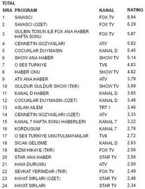 14 Ocak 2018 Pazar Reyting Sonuçları