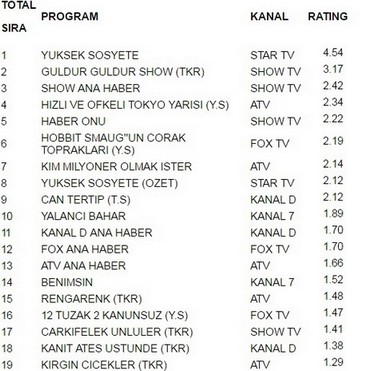 Star tv ekranlarında yayınlanan Yüksek Sosyete 4.54 reytingle 14 temmuz perşembe günü en çok izlenen programı oldu. Yüksek Sosyete büyük bir başarıya imza atarak Güldür Güldür Show (Tkr)’u geride bıraktı. Güldür Güldür Show (Tkr) 3.17 reytingle ancak 2. olabildi. İlginçtir ki reytinglerde 3.lüğe ise 2.42 reytingle Show Ana Haber yerleşti.