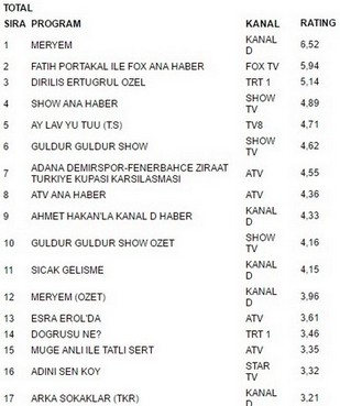 15 Aralık 2017 Cuma Reyting Sonuçları