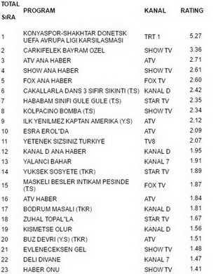 Star tv ekranlarında yayınlanan Konyaspor – Shaktar Donetsk Uefa Avrupa Ligi Karşılaşması 5.27 reytingle 15 eylül perşembe günü en çok izlenen programı oldu. Konyaspor – Shaktar Donetsk büyük bir başarıya imza atarak Çarkıfelek Bayram Özel’i geride bıraktı. Çarkıfelek Bayram Özel 3.36 reytingle ancak 2. olabildi. İlginçtir ki reytinglerde 3.lüğe ise 2.71 reytingle Atv Ana Haber yerleşti.