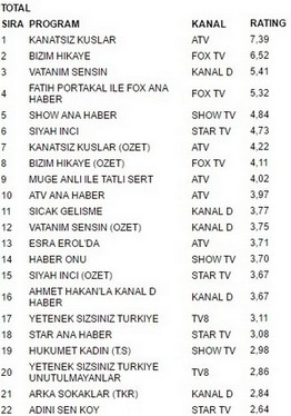 Atv ekranlarında yayınlanan Kanatsız Kuşlar dizisi 16 kasım perşembe günü aldığı 7.39 reytingle en çok izlenen program oldu.Kanatsız Kuşlar büyük bir başarıya imza atarak fox tv ekranlarında yayınlanan Bizim Hikaye’yi geçmeyi başardı.Bizim Hikaye 6.52 reyting oranıyla 2. olurken. İlginçtir ki reytinglerde 3.lüğe ise 5.41 reytingle Vatanım Sensin yerleşti