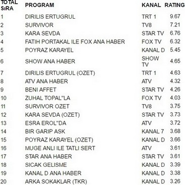 Trt 1 ekranlarında yayınlanan Diriliş Ertuğrul 9.67 reytingle 16 Mart Çarşamba gününün en çok izlenen programı oldu. Diriliş Ertuğrul büyük bir başarıya imza atarak Survivor’ı geride bıraktı. Survivor 7.21 reytingle ancak 2. olabildi. İlginçtir ki reytinglerde 3.lüğe ise 6.76 reytingle Kara Sevda yerleşti.