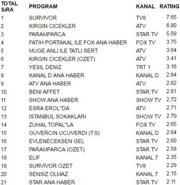 Tv8 ekranlarında yayınlanan Survivor 7.65 reytingle 16 Mayıs pazartesi günü en çok izlenen programı oldu.Survivor büyük bir başarıya imza atarak Kırgın Çiçekler’i geride bıraktı. Kırgın Çiçekler 6.80 reytingle ancak 2. olabildi. İlginçtir ki reytinglerde 3.lüğe ise 5.59 reytingle Paramparça yerleşti.