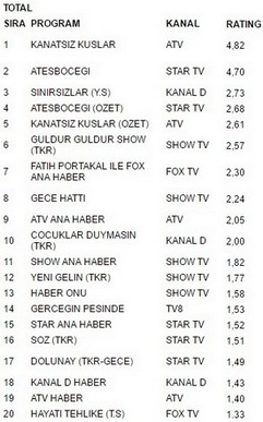 Atv ekranlarında yayınlanan Kanatsız Kuşlar 4.82  reytingle 17 ağustos perşembe günü en çok izlenen program oldu. Kanatsız Kuşlar büyük bir başarıya imza atarak star tv ekranlarında yayınlanan Ateş Böceği’ni geçmeyi başardı. Ateşböceği 4.70 reyting oranıyla 2. olurken. İlginçtir ki reytinglerde 3.lüğe ise 2.73 reytingle Sınırsızlar (Y.S) yerleşti.