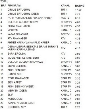 Trt 1 ekranlarında yayınlanan Diriliş Ertuğrul 17 ocak çarşamba akşamı aldığı 17.00 reytingle en çok izlenen program oldu.Diriliş Ertuğrul büyük bir başarıya imza atarak Kanal D ekranlarında yayınlanan Meryem’i geçmeyi başardı. Diriliş Ertuğrul Özet 7.70 reyting oranıyla 2. olurken. İlginçtir ki reytinglerde 3.lüğe ise 6.15 reytingle Fatih Portakal İle Fox Ana Haber yerleşti