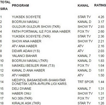 Star tv ekranlarında yayınlanan Yüksek Sosyete 4.26 reytingle 18 ağustos perşembe günü en çok izlenen programı oldu. Yüksek Sosyete büyük bir başarıya imza atarak Bodrum Masalı’nı geride bıraktı. Bodrum Masalı 3.17 reytingle ancak 2. olabildi. İlginçtir ki reytinglerde 3.lüğe ise 2.93 reytingle Güldür Güldür Show yerleşti.