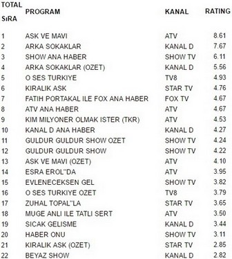 18 Kasım Çarşam Reyting Sonuçları: