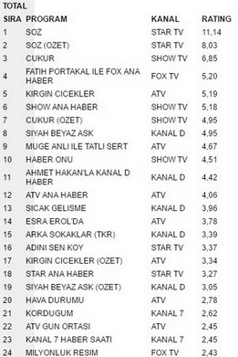 Star tv ekranlarında yayınlanan Söz dizisi 20 kasım pazartesi günü aldığı 11.14 reytingle en çok izlenen program oldu.Söz büyük bir başarıya imza atarak show tv ekranlarında yayınlanan Çukur’u geçmeyi başardı.Söz Özet 8.03 reyting oranıyla 2. olurken. İlginçtir ki reytinglerde 3.lüğe ise 6.85 reytingle Çukur yerleşti