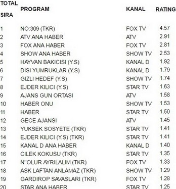 Fox tv ekranlarında yayınlanan No 309 (TKR) 4.57 reytingle 20 temmuz çarşamba günü en çok izlenen programı oldu. No 309 (TKR) bir başarıya imza atarak Atv Ana Haber’i geride bıraktı. Atv Ana Haber 2.91 reytingle ancak 2. olabildi. İlginçtir ki reytinglerde 3.lüğe ise 2.81 reytingle Fox Ana Haber yerleşti.
