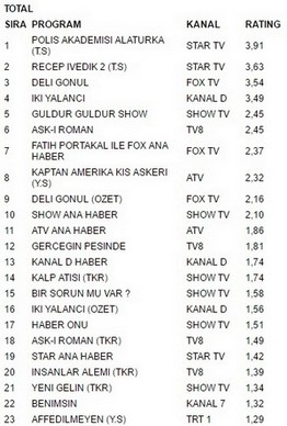 Star tv ekranlarında yayınlanan Polis Akademisi Alaturka (TS) 3.91 reytingle 21 ağustos pazartesi günü en çok izlenen program oldu.Polis Akademisi Alaturka (TS) büyük bir başarıya imza atarak star tv ekranlarında yayınlanan Recep İvedik 2’yi  geçmeyi başardı. Recep İvedik 2 (T.S) 3.63 reyting oranıyla 2. olurken. İlginçtir ki reytinglerde 3.lüğe ise 3.54 reytingle Deli Gönül yerleşti.