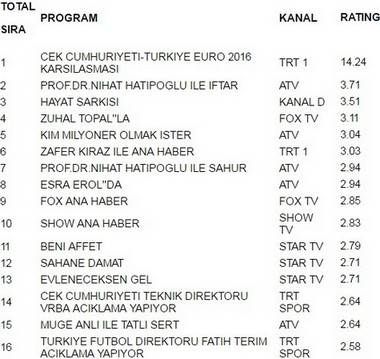 Trt 1 ekranlarında yayınlanan Cek Cumhuriyeti – Turkiye Euro 2016 Karşılaşması 14.24 reytingle 21 Haziran Salı günü en çok izlenen programı oldu.Cek Cumhuriyeti – Turkiye Euro 2016 Karşılaşması büyük bir başarıya imza atarak Prof Dr Nihat Hatipoğlu İle İftar’ı geride bıraktı. Prof Dr Nihat Hatipoğlu İle İftar 3.71 reytingle ancak 2. olabildi. İlginçtir ki reytinglerde 3.lüğe ise 3.51 reytingle Hayat Şarkısı yerleşti.