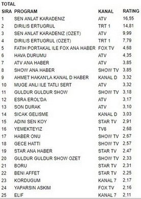 Atv ekranlarında yayınlanan Sen Anlat Karadeniz 21 mart çarşamba akşamı aldığı 16.55 reytingle en çok izlenen program oldu. Sen Anlat Karadeniz büyük bir başarıya imza atarak atv ekranlarında yayınlanan Diriliş Ertuğrul’u geçmeyi başardı.Diriliş Ertuğrul 14.81 reyting oranıyla 2. olurken. İlginçtir ki reytinglerde 3.lüğe ise 9.99 oranla Sen Anlat Karadeniz Özet yerleşti.
