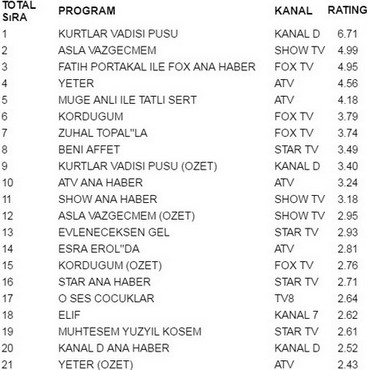 21 Nisan 2016 Perşembe Reyting Sonuçları