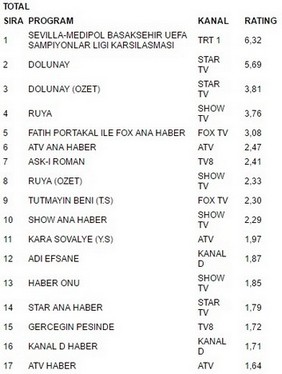 Trt 1 ekranlarında yayınlanan Sevilla – Medipol Başakşehir Uefa Şampiyonlar Ligi Karşılaşması 6.32 reytingle 22 ağustos salı günü en çok izlenen program oldu.Sevilla – Medipol Başakşehir karşılaşması büyük bir başarıya imza atarak star tv ekranlarında yayınlanan Dolunay’ı geçmeyi başardı. Dolunay 5.69 reyting oranıyla 2. olurken. İlginçtir ki reytinglerde 3.lüğe ise 3.81 reytingle Dolunay Özet yerleşti.