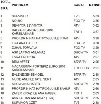 22 Haziran 2016 Çarşamba Reyting Sonuçları