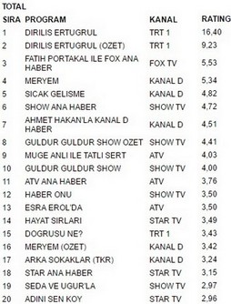 Trt 1 ekranlarında yayınlanan Diriliş Ertuğrul dizisi 22 kasım pazartesi günü aldığı 11.14 reytingle en çok izlenen program oldu.Diriliş Ertuğrul büyük bir başarıya imza atarak Kanal D ekranlarında yayınlanan Meryem‘i geçmeyi başardı.Diriliş Ertuğrul Özet 9.23 reyting oranıyla 2. olurken. İlginçtir ki reytinglerde 3.lüğe ise 5.53 reytingle Fatih Portakal İle Fox Ana Haber yerleşti