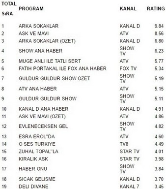 Kanal D ekranlarında yayınlanan Arka Sokaklar 9.84 reytingle 23 aralık cuma günü en çok izlenen programı oldu. Arka Sokaklar büyük bir başarıya imza atarak Aşk ve Mavi’yi geride bıraktı. Aşk ve Mavi 8.56 reyting oranıyla 2. olurken. İlginçtir ki reytinglerde 3.lüğe ise 6.80 reytingle Arka Sokaklar Özet yerleşti.