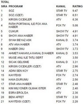 Star tv ekranlarında yayınlanan Söz dizisi 23 ekim pazartesi günü aldığı 9.47 reytingle en çok izlenen program oldu. Söz büyük bir başarıya imza atarak atv -ekranlarında yayınlanan Kırgın Çiçekler‘i geçmeyi başardı.Söz Özet 6.51 reyting oranıyla 2. olurken. İlginçtir ki reytinglerde 3.lüğe ise 6ç36 reytingle Kırgın Çiçekler yerleşti. Listenin 4. sırasına her zaman ilk 5’e girmeyi başaran Fatih Portakal İle Fox Ana Haber yerleşti. 5. sırada ise gayet iyi bir başlangıç yaparak zorlu rakipleri arasında 4.91 reyting almayı başaran show tv ekranlarının yeni dizisi Çukur bulunuyor.