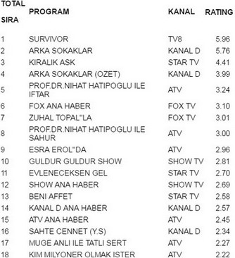 Tv8 ekranlarında yayınlanan Survivor 5.96 reytingle 24 Haziran Cuma günü en çok izlenen programı oldu.Survivor büyük bir başarıya imza atarak Arka Sokaklar’ı geride bıraktı.Arka Sokaklar 5.76 reytingle ancak 2. olabildi. İlginçtir ki reytinglerde 3.lüğe ise 4.41 reytingle Kiralık Aşk yerleşti.