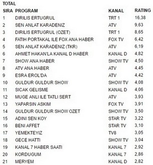 Trt 1 ekranlarında yayınlanan Diriliş Ertuğrul 24 ocak çarşamba akşamı aldığı 16.38 reytingle en çok izlenen program oldu.Diriliş Ertuğrul büyük bir başarıya imza atarak atv ekranlarında yayınlanan Sen Anlat Karadeniz geçmeyi başardı.Sen Anlat Karadeniz 9.63 reyting oranıyla 2. olurken. İlginçtir ki reytinglerde 3.lüğe ise 8.65 reytingle Diriliş Ertuğrul Özet yerleşti.