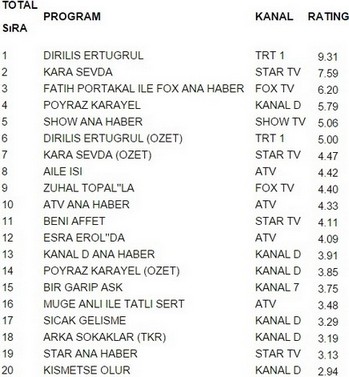 Trt 1 ekranlarının en sevilen dizisi Diriliş Ertuğrul 9.31 reytingle 24 Şubat çarşamba gününün en çok izlenen programı oldu. Diriliş Ertuğrul büyük bir başarıya imza atarak Kara Sevda’yı geride bıraktı. Kara Sevda 7.59 reytingle ancak 2. olabildi. İlginçtir ki reytinglerde 3.lüğe ise 6.20 reytingle Fatih Portakal İle Fox Ana Haber yerleşti.