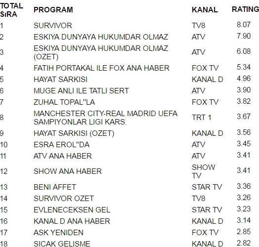 Tv8 ekranlarında yayınlanan Survivor 8.07 reytingle 26 Nisan salı günü en çok izlenen programı oldu.Survivor büyük bir başarıya imza atarak Eşkiya Dünyaya Hükümdar Olmaz’ı geride bıraktı. Eşkiya Dünyaya Hükümdar Olmaz 7.90 reytingle ancak 2. olabildi. İlginçtir ki reytinglerde 3.lüğe ise 6.08 reytingle Eşkiya Dünyaya Hükümdar Olmaz (Özet) yerleşti.