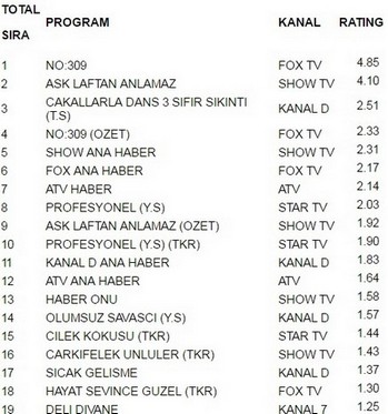 Fox tv ekranlarında yayınlanan No 309 4.85 reytingle 27 temmuz çarşamba günü en çok izlenen programı oldu. No 309 bir başarıya imza atarak Aşk Laftan Anlamaz’ı geride bıraktı. Aşk Laftan Anlamaz 4.10 reytingle ancak 2. olabildi. İlginçtir ki reytinglerde 3.lüğe ise 2.51 reytingle Çakallarla Dans 3 Sıfır Sıkıntı yerleşti.