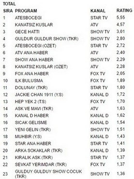 Star tv ekranlarında yayınlanan AteşBöceği 5.55 reytingle 27 temmuz perşembe günü en çok izlenen program oldu. AteşBöceği büyük bir başarıya imza atarak fox tv ekranlarında yayınlanan Kanatsız Kuşlar’ı geçmeyi başardı. Kanatsız Kuşlar 4.57 reyting oranıyla 2. olurken. İlginçtir ki reytinglerde 3.lüğe ise 3.01 reytingle Gece Hattı yerleşti.