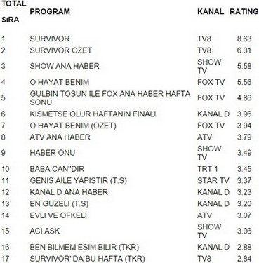 Fox ekranlarının en sevilen dizisi Survivor 8.63 reytingle 28 Şubat pazar gününün en çok izlenen programı oldu. Survivor büyük bir başarıya imza atarak O Hayat Benim’i geride bıraktı.Show Ana Haber 5.58 reytingle ancak 3. olabildi. İlginçtir ki reytinglerde 4.lüğe ise 5.56 reytingle O Hayat Benim yerleşti.