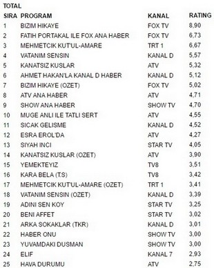 29 Ocak 2018 Pazartesi Reyting Sonuçları