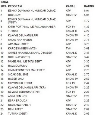 Atv ekranlarında yayınlanan Eşkiya Dünyaya Hükümdar Olmaz 8.91 reytingle 3 ekim salı günü en çok izlenen program oldu.Eşkiya Dünyaya Hükümdar Olmaz büyük bir başarıya imza atarak Atv ekranlarında yayınlanan Dolunay geçmeyi başardı. Dolunay 5.06 reyting oranıyla 2. olurken. İlginçtir ki reytinglerde 3.lüğe ise 4.72 reytingle Eşkiya Dünyaya Hükümdar Olmaz Özet yerleşti.