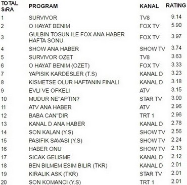 Tv8 ekranlarında yayınlanan Survivor 9.14 reytingle 3 Nisan Pazar gününün en çok izlenen programı oldu.Survivor büyük bir başarıya imza atarak O Hayat Benim‘i geride bıraktı.O Hayat Benim 5.90 reytingle ancak 2. olabildi. İlginçtir ki reytinglerde 3.lüğe ise 3.97 reytingle Gülbin Tosun İle Fox Ana Haber yerleşti.