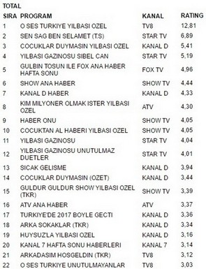 Tv8 ekranlarında yayınlanan O Ses Türkiye Yılbaşı Özel programı 31 aralık 2017 gecesi aldığı 12.81 reytingle en çok izlenen program oldu. O Ses Türkiye Yılbaşı Özel büyük bir başarıya imza atarak star tv ekranlarında yayınlanan Sen Sağ Ben Selamet geçmeyi başardı.Sen Sağ Ben Selamet 6.89 reyting oranıyla 2. olurken. İlginçtir ki reytinglerde 3.lüğe ise 5.41 reytingle Çocuklar Duymasın Yılbaşı Özel yerleşti