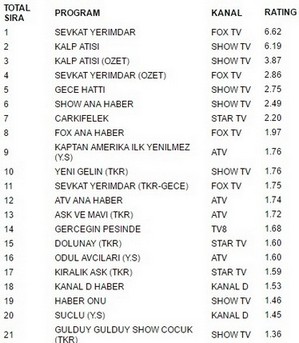 Fox tv ekranlarında yayınlanan Şevkat Yerimdar 6.62 reytingle 4 ağustos cuma günü en çok izlenen program oldu. Şevkat Yerimdar büyük bir başarıya imza atarak show tv ekranlarında yayınlanan Kalp Atışı’nı geçmeyi başardı. Kalp Atışı 6.19 reyting oranıyla 2. olurken. İlginçtir ki reytinglerde 3.lüğe ise 3.87 reytingle Kalp Atışı (Özet) yerleşti.