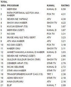 Kanal D ekranlarında yayınlanan Meryem 6.59 reytingle 4 ekim çarşamba günü en çok izlenen program oldu. Meryem büyük bir başarıya imza atarak fox tv ekranlarında yayınlanan Fatih portakal İle Fox Ana Haber’i geçmeyi başardı. Fox Ana Haber 4.31 reyting oranıyla 2. olurken. İlginçtir ki reytinglerde 3.lüğe ise 4.30 reytingle Seven Ne Yapmaz yerleşti.