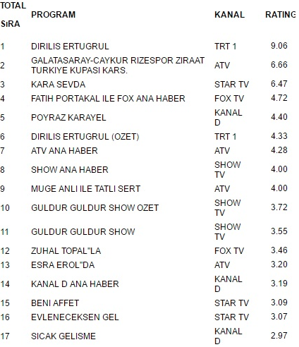 Trt 1 ekranlarında yayınlanan Diriliş Ertuğrul 9.01 reytingle 4 Mayıs Çarşamba günü en çok izlenen programı oldu.Diriliş Ertuğrul büyük bir başarıya imza atarak Galatasaray-Çaykur Rizespor Ziraat Türkiye Kupası Karşılaşması’nı geride bıraktı. Galatasaray-Çaykur Rizespor Ziraat Türkiye Kupası 6.66 reytingle ancak 2. olabildi. İlginçtir ki reytinglerde 3.lüğe ise 6.47 reytingle Kara Sevda yerleşti.