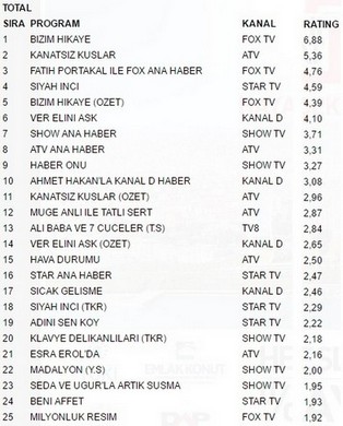 Fox tv ekranlarında yayınlanan Bizim Hikaye 6.88 reytingle 5 ekim perşembe günü en çok izlenen program oldu. Bizim Hikaye büyük bir başarıya imza atarak Atv ekranlarında yayınlanan Kanatsız Kuşlar’ı geçmeyi başardı. Kanatsız Kuşlar 5.36 reyting oranıyla 2. olurken. İlginçtir ki reytinglerde 3.lüğe ise 4.76 reytingle Fatih Portakal İle Fox Ana Haber yerleşti.